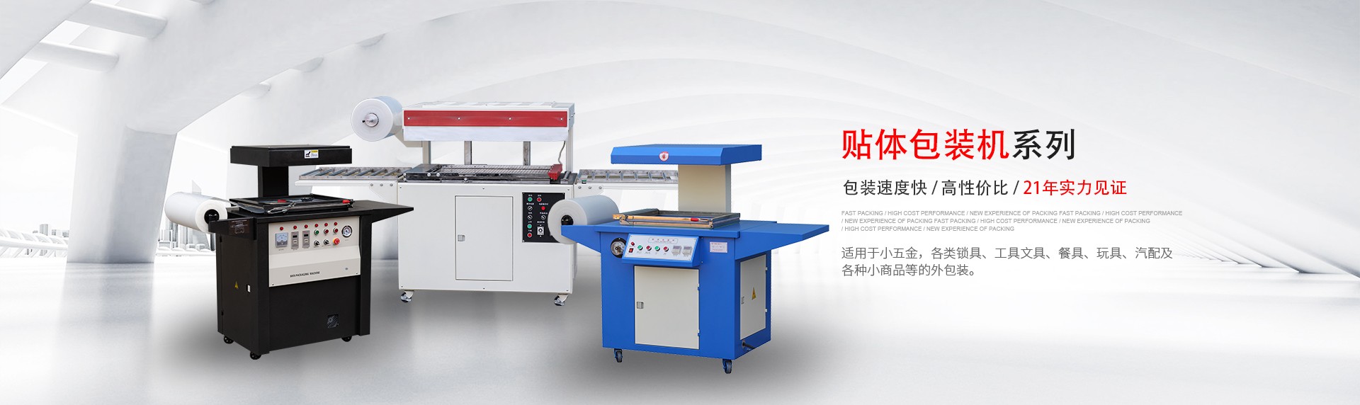 現主要產品有:全自動 L 型、邊封薄膜封切機、節(jié)能噴氣式內循環(huán)熱收縮機、貼體包裝機、吸塑包裝機、高周波塑膠熔接機、袖口式套膜機、枕式包裝機等多個系列的包裝機械